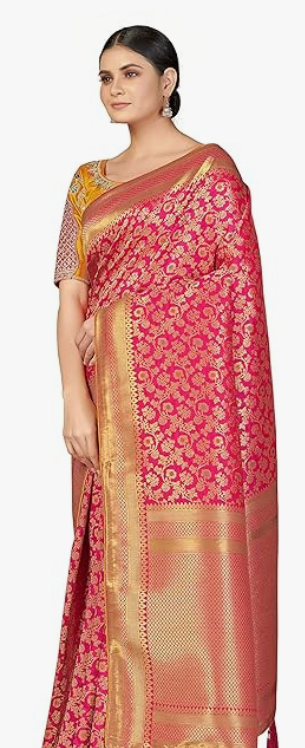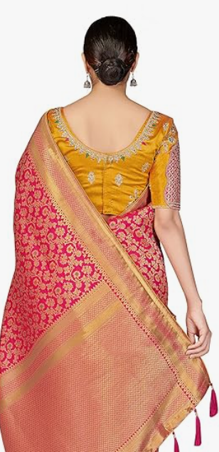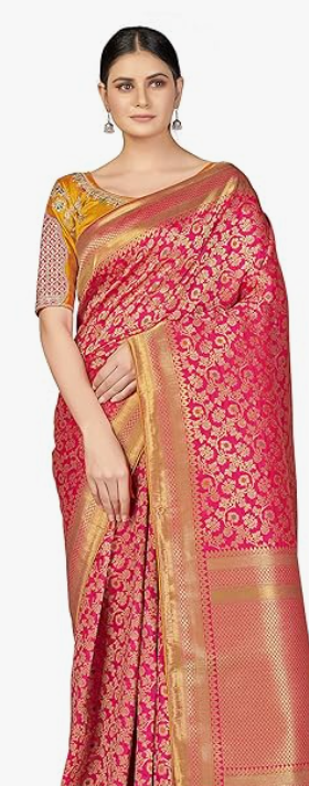 - Product Highlights : Fabric: Banarasi Silk Blend (Saree) Art Silk (Blouse) || Work: Zari Woven (Saree), Zari & Embroidery (Blouse) || Colour: Saree –Pink | Blouse – Yellow || This Banarasi Silk Saree with Subtle Zari Work.