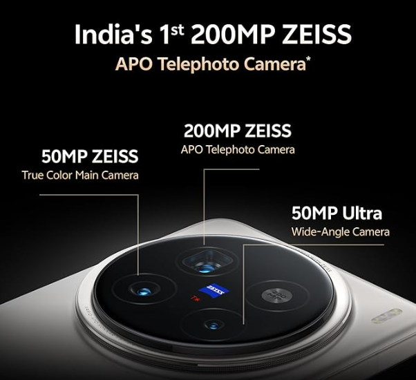 Camera: Main camera- 50 MP | vivo Sony LYT-818 Sensor | 1/1.28 “ | f/1.57 | 23 mm equivalent focal distance | VCS Camera-Bionic Spectrum 3.0 | optical precision calibration | New GLC Coating | Telephoto camera-200 MP | HP9 Sensor | 1/1.4″ (124% light intake increase) | f/2.67 | 85 mm equivalent focal distance | 15 cm macro | 3.7x optical zoom | 100x digital zoom | APO certification | OIS | CIPA 4.5 | Ultra Wide Camera – 50 MP | JN1 | 1/2.76″ | 15 mm equivalent focal distance, V3+ Chip